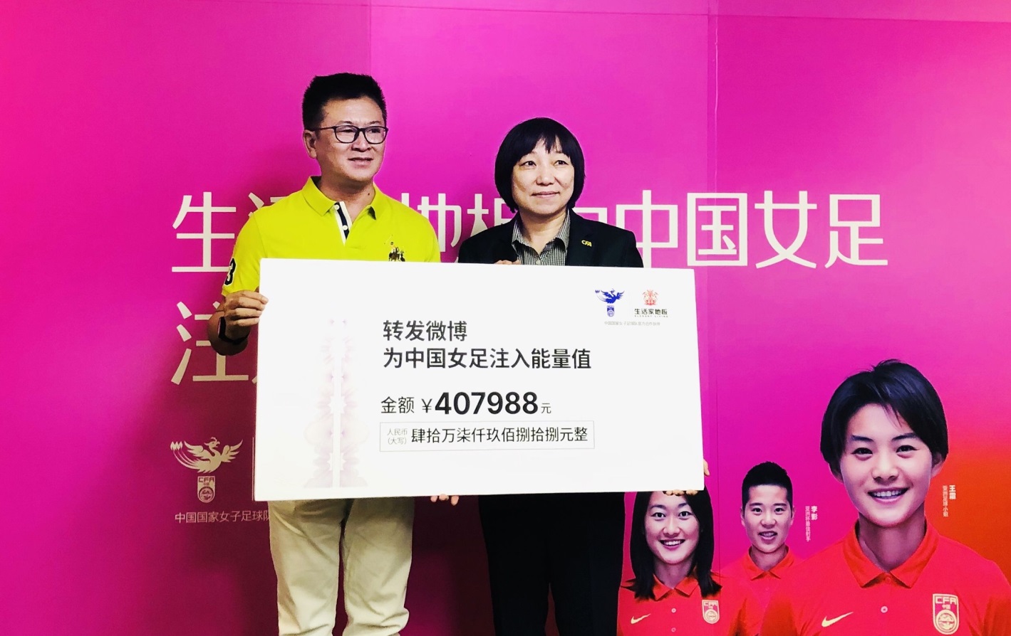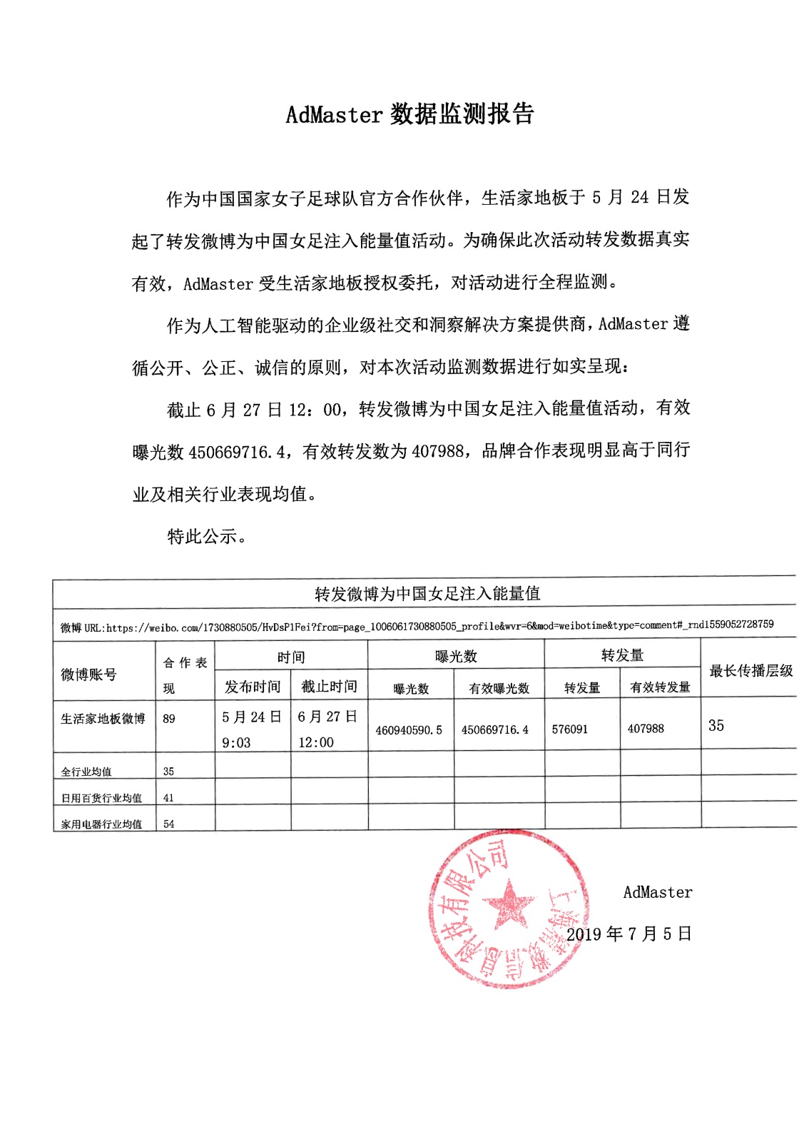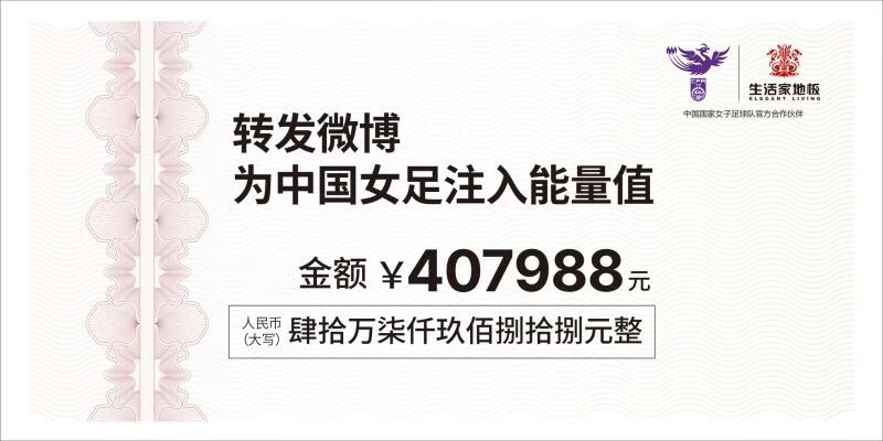 經(jīng)權(quán)威數(shù)據(jù)公司AdMaster鑒定,截止 6 月 27 日 12 : 00,生活家助力中國(guó)女足轉(zhuǎn)發(fā)活動(dòng)有效曝光數(shù)為450669716次,有效轉(zhuǎn)發(fā)數(shù)為407988次,按照轉(zhuǎn)發(fā)規(guī)則,生活家地板正式為中國(guó)女足兌現(xiàn)407988元能量基金。