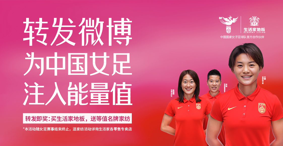 為呼吁全民關(guān)注女足,助力中國(guó)女足發(fā)展,今年法國(guó)女足世界杯期間,生活家地板在新浪微博發(fā)起了#轉(zhuǎn)發(fā)微博為中國(guó)女足注入能量值#的線上線下聲援行動(dòng),旨在呼吁更多人關(guān)注中國(guó)女足賽事,展示中國(guó)女足努力拼搏、頑強(qiáng)不息的風(fēng)采。