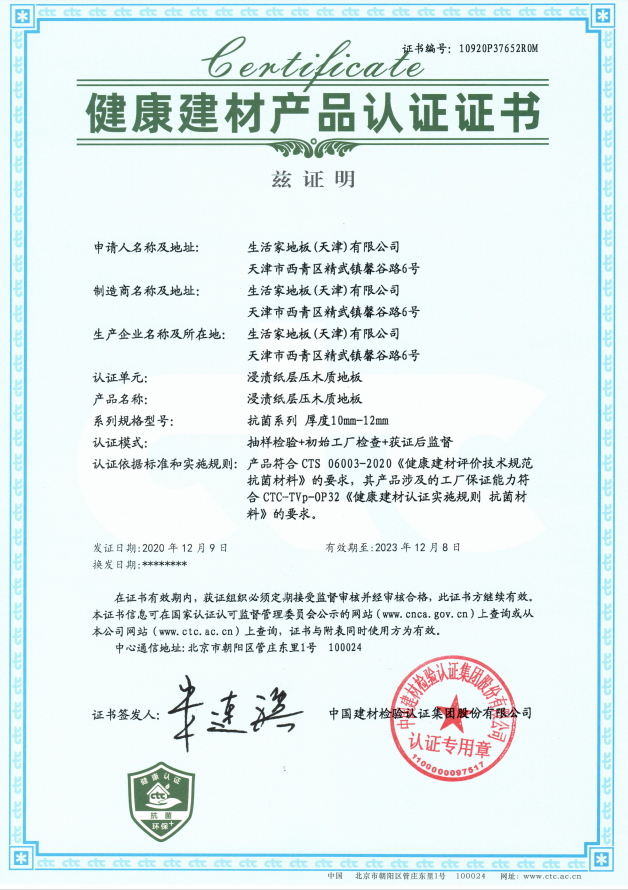 近日,生活家極地系列納米鹽抗菌地板,正式獲得CTC(中國(guó)建材檢驗(yàn)認(rèn)證集團(tuán)股份有限公司)頒發(fā)的健康建材認(rèn)證證書,證書編號(hào)10920P37652ROM,發(fā)證日期為2020年12月9日。