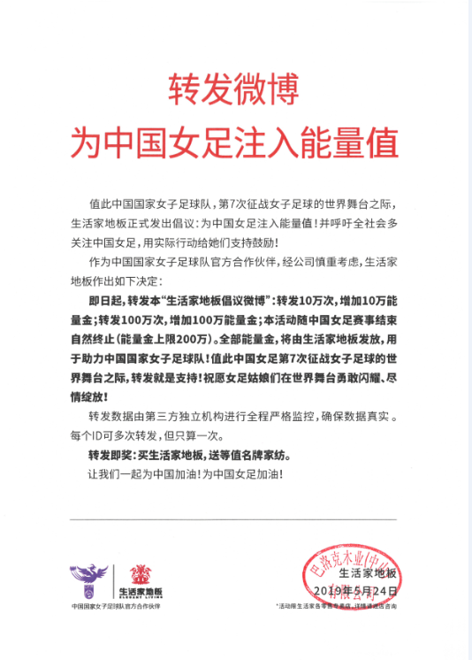 作為中國國家女子足球隊(duì)官方合作伙伴,為支持中國女足,生活家地板在新浪微博平臺(tái)發(fā)起